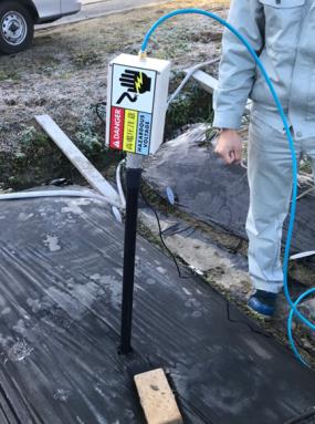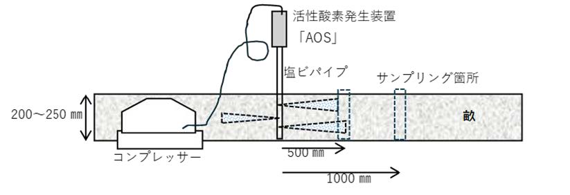 活性酸素生成装置「AOS」(小型試験用タイプ)に、先に吹出し口を開けた塩ビ管を取り付け、この吹出し口からから土壌中に活性酸素が出るようにしました。