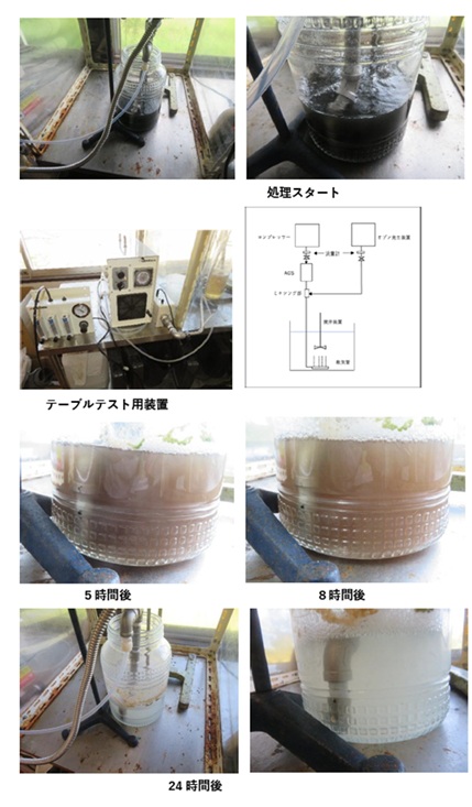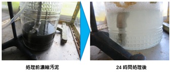 処理開始から数時間で汚泥の可溶化が進行し、24時間後には濃縮汚泥が完全に分解・消滅することを確認しました。